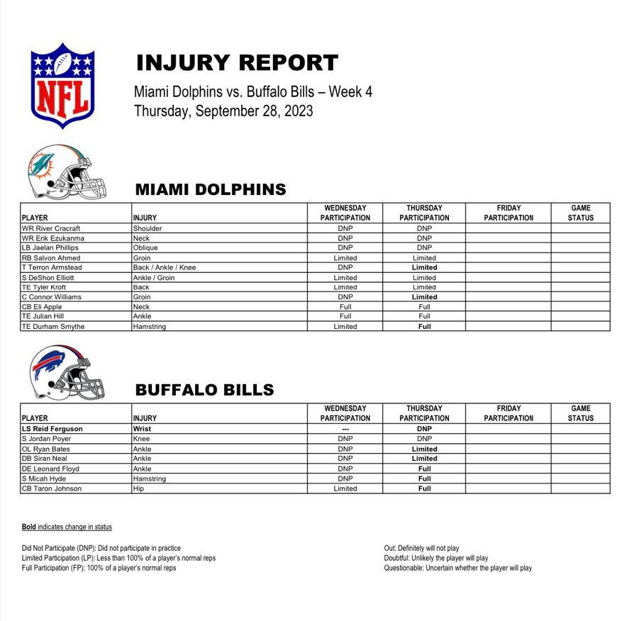 Thursday Miami Dolphins injury update for Week 4 vs. Buffalo Bills