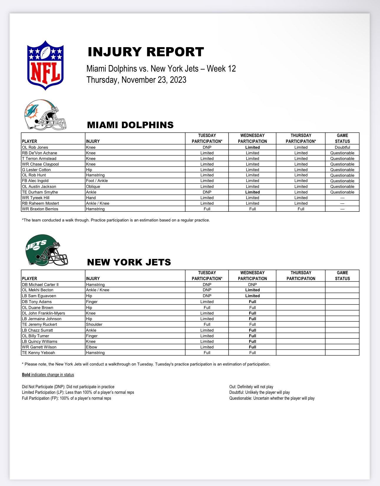 Final Miami Dolphins injury report for NFL Week 12 vs. Jets