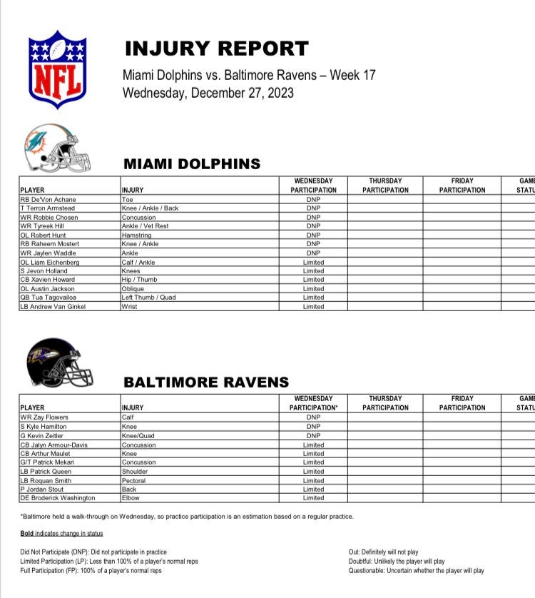 The Miami Dolphins released their initial injury report for their Week 17 tilt with the Baltimore Ravens, and there was a rather surprising name included.
