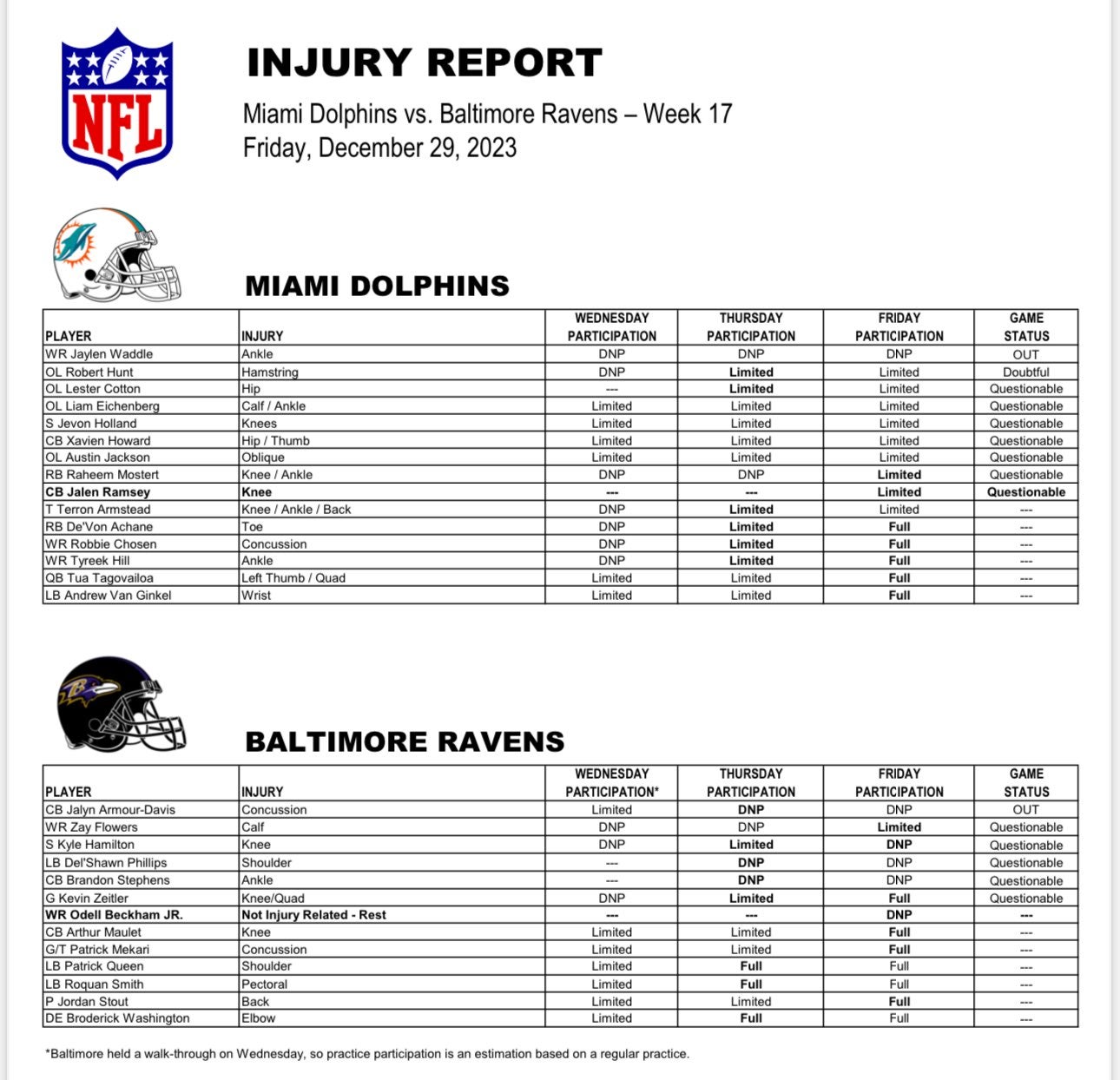 Now the wait is on for Sunday morning when the Dolphins release their inactives 90 minutes before kickoff.  If the Dolphins' former All-Pro corner can't go, then Miami will be severely limited in trying to stop perhaps the leading MVP candidate in Lamar Jackson.