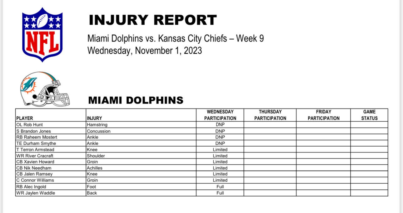 The Dolphins had a slew of starters miss Wednesday's practice. G Robert Hunt, who Mike McDaniel referred to as "day to day" on Wednesday, missed Wednesday's practice with a hamstring injury, as did TE Durham Smythe with an ankle. Speaking of ankles, RB Raheem Mostert missed practice, but he also missed Wednesday's practice last week and played, so as long as he's back tomorrow, then Wednesday was likely more maintenance.