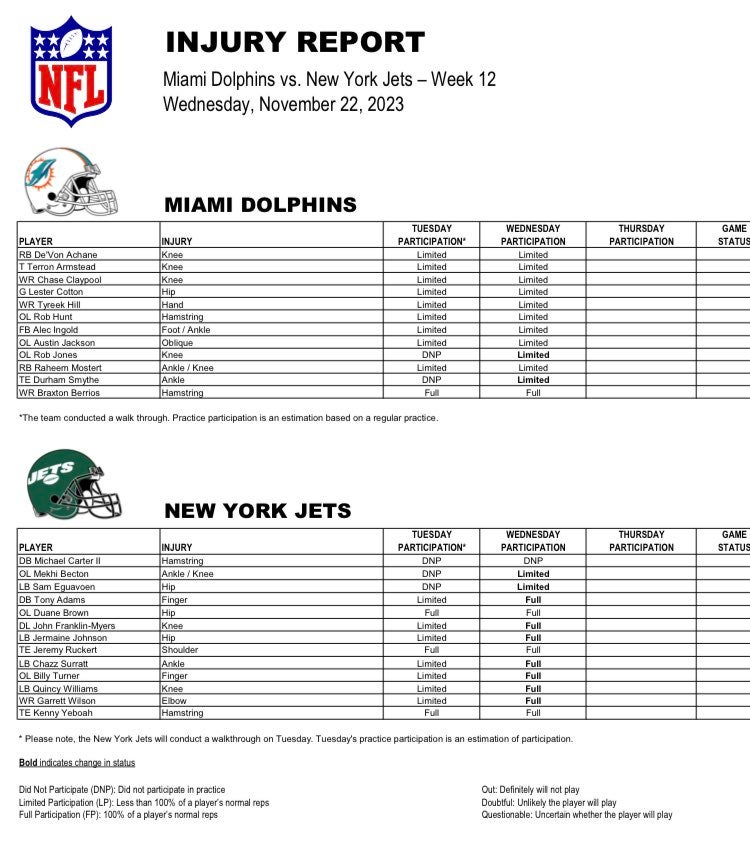Dolphins' Wednesday practice report for Week 12 vs. Jets