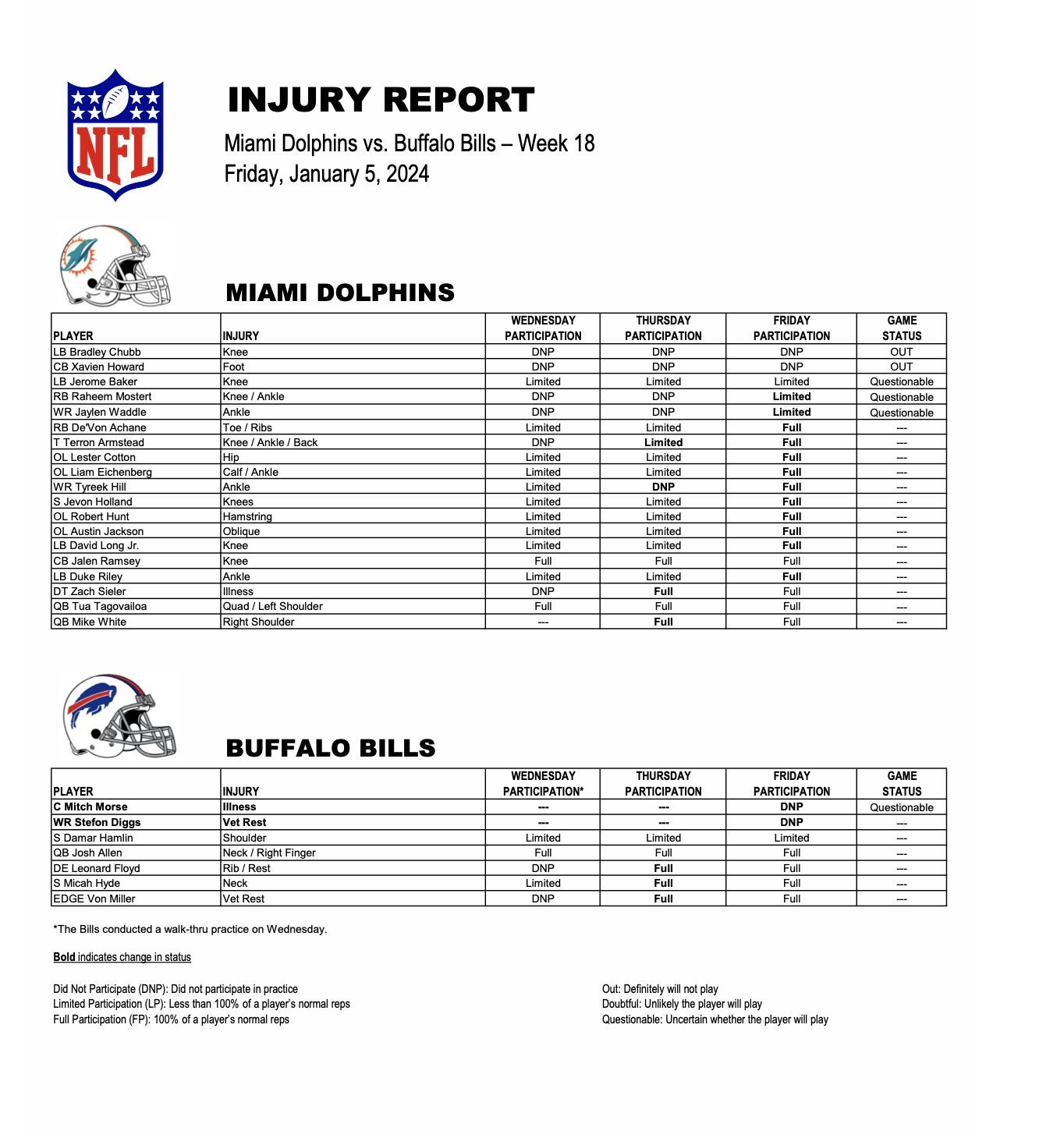 The final injury report was released on Friday, and the vast majority of Miami's players were able to avoid an injury designation for Sunday night's tilt with Buffalo.