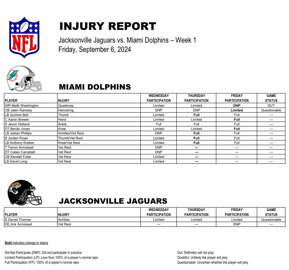 The team released its final injury report on Friday afternoon ahead of the team's season-opening contest against the Jacksonville Jaguars on Sunday afternoon at Hard Rock Stadium.