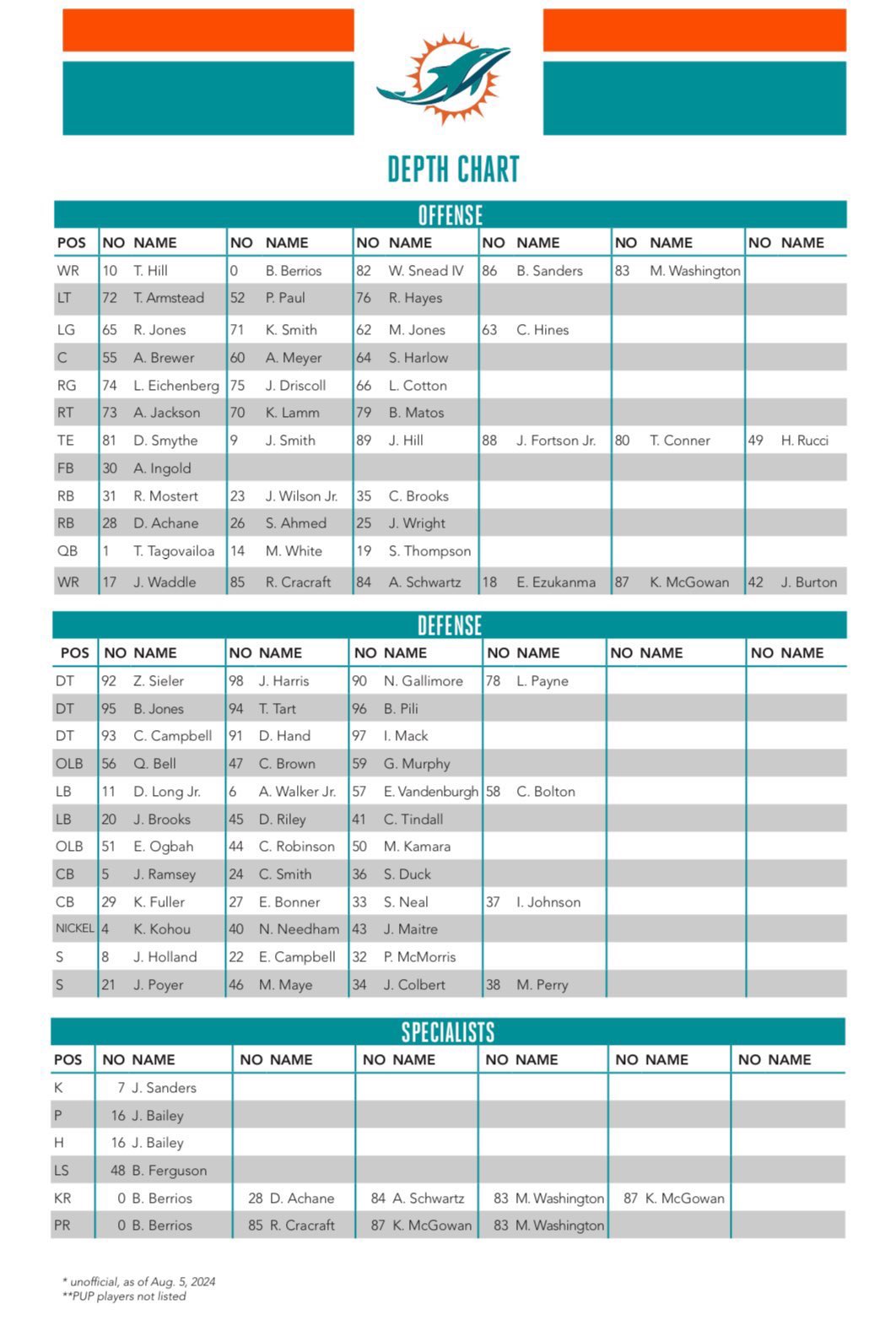Breaking down the Miami Dolphins' first depth chart of 2024 training camp