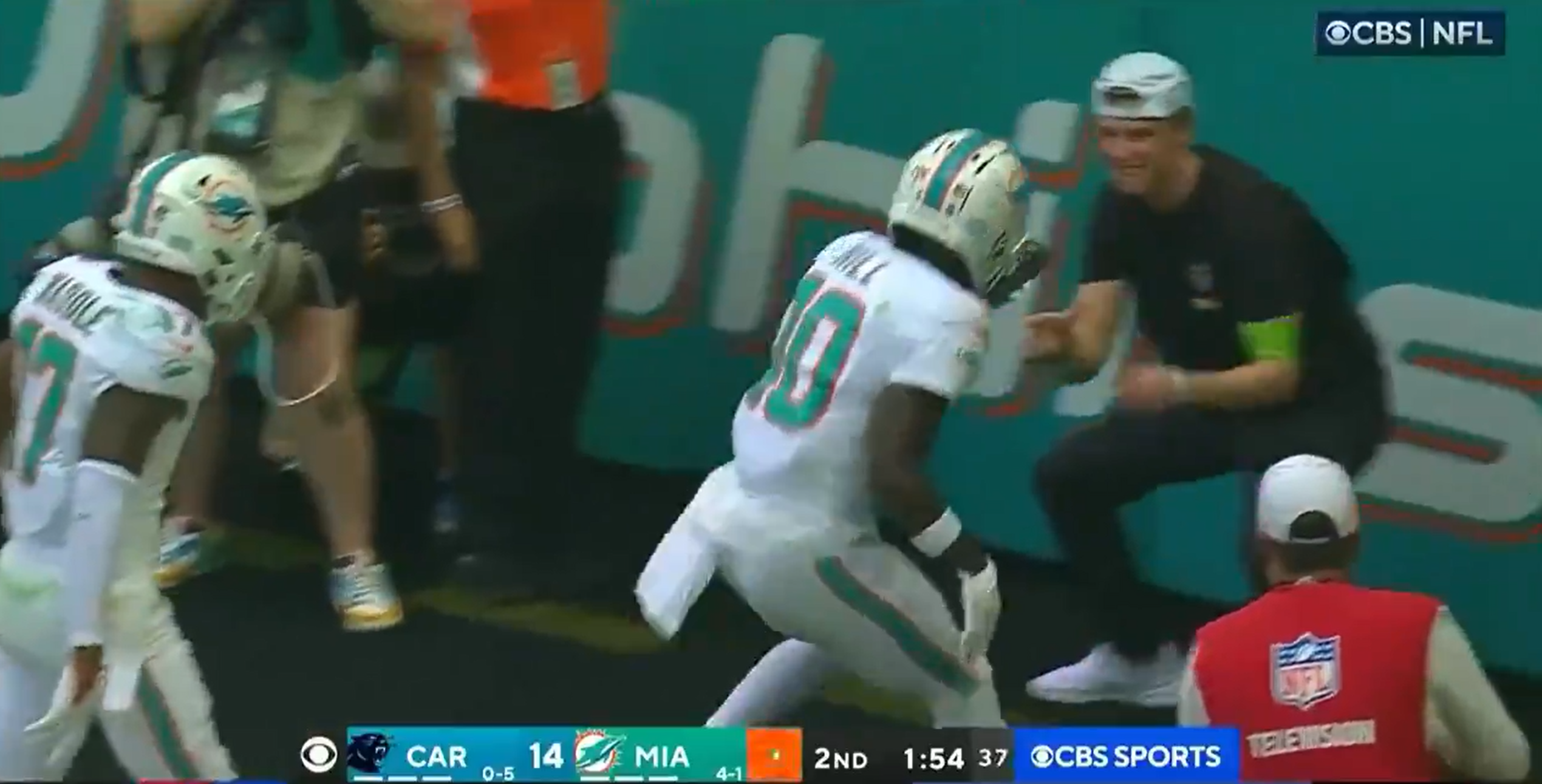 One of the biggest highlights of Week 6 of the NFL came in the Dolphins' 42-21 win over the Carolina Panthers. Tyreek Hill caught a 41-yard touchdown pass and immediately ran over to an unknown man in the end zone. Hill took a cell phone from him and recorded a selfie of him doing a backflip before handing the phone back and running off.