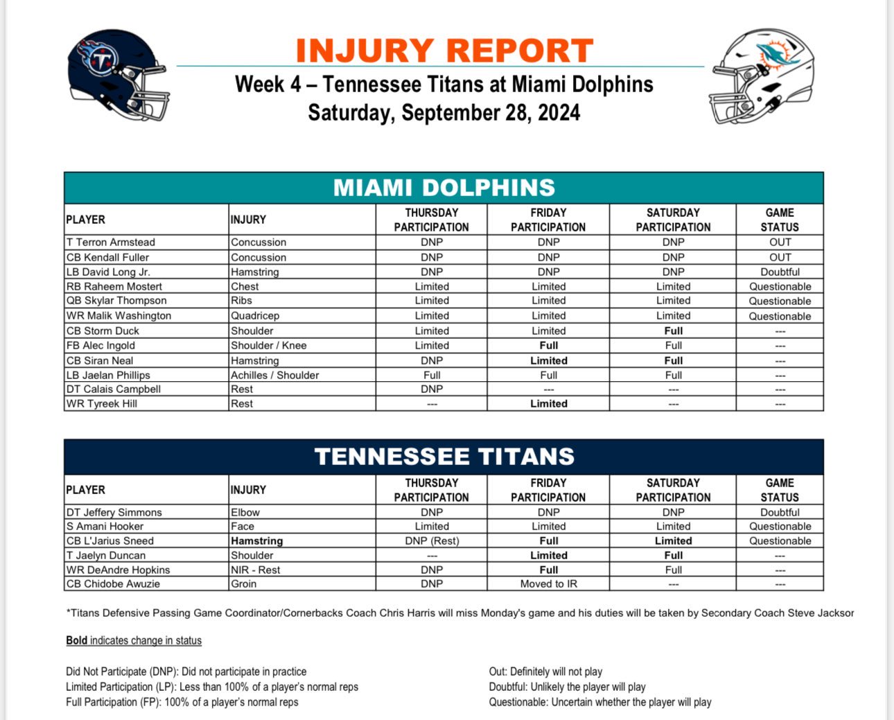RB Raheem Mostert and WR Malik Washington are both questionable.  Their status will be made known formally when the inactives are released an hour and a half before kickoff on Monday night.