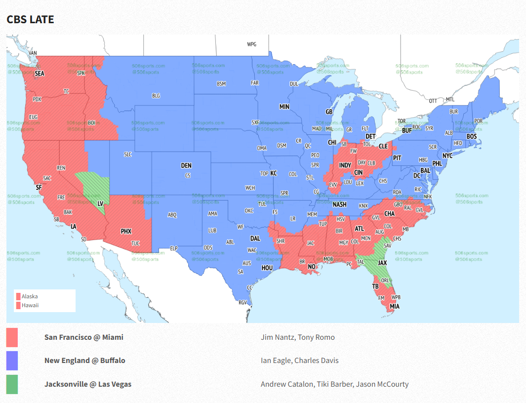 Miami fans across much of the southeast will be pleased, as the game will stretch from the Ark-La-Tex area straight across the Deep South and up through North Carolina, with parts of Florida, Georgia, and South Carolina excluded for Jacksonville-Las Vegas.  The West Coast from San Diego up to Seattle will have the game as well, with most of Arizona included.
