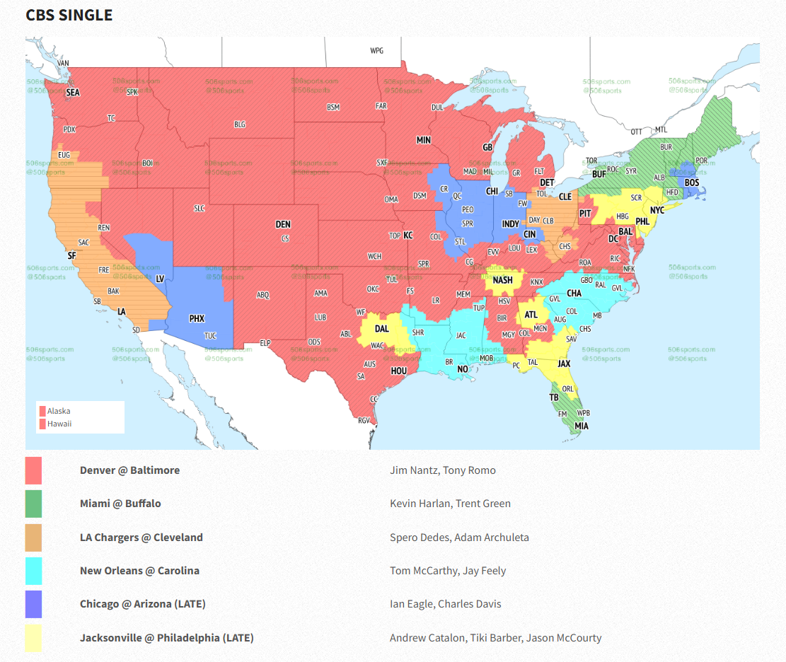 Much of the New York and New England areas will receive the game locally, with the exception of the New York City and Boston regional areas. Those areas have local competing 1:00 pm games on FOX involving the Giants and Patriots, respectively.