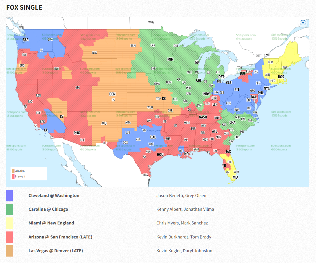 The game will be shown locally in parts of Florida, not making it into even the panhandle.  All of the states in New England with the exception of part of Connecticut will get the game as well.  That's it.  Often, you'll see pockets of space across the country getting the game, with Alabama and/or Hawaii often getting the game thanks to Tua Tagovailoa.  With the Dolphins' franchise QB on the injured reserve list, that's not the case on Sunday.