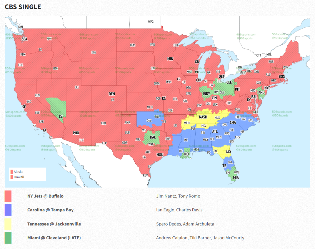 Per 506Sports.com, the game will be broadcast in a number of isolated metro areas, as well as South Florida and Ohio. Andrew Catalon, Tiki Barber, and Jason McCourty will be on the call for CBS.