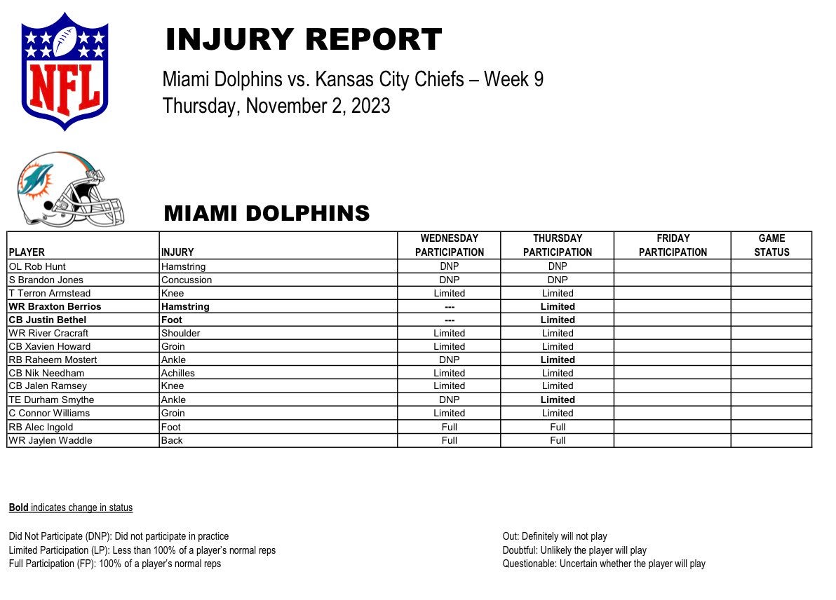 Thursday Miami Dolphins injury report vs. Chiefs Week 9