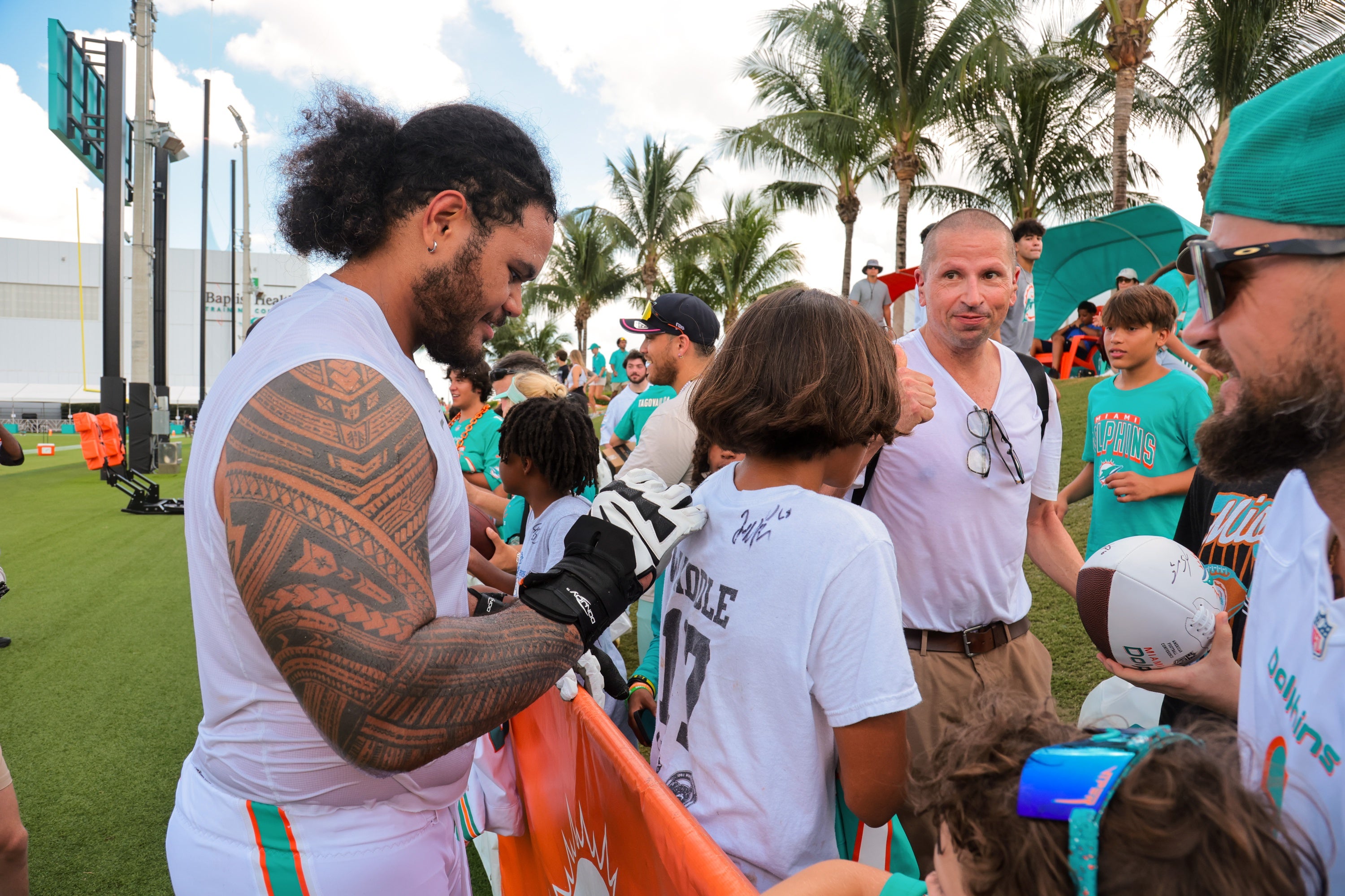 Jul 29, 2025; Miami Gardens, FL, USA; Miami Dolphins guard Jonah Savaiinaea (72) signs the jersey of a fan during training camp at Baptist Health Training Complex. Sam Navarro-Imagn Images