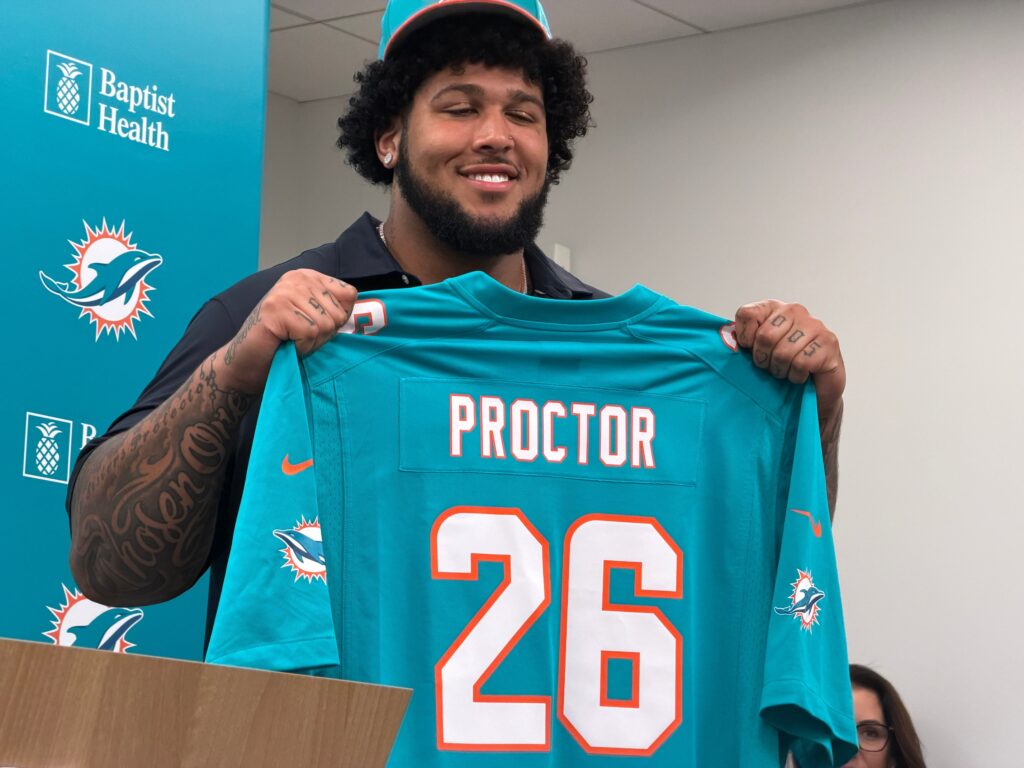 Miami Dolphins’ first-round pick Kadyn Proctor with his new jersey on April 24, 2026.Hal Habib