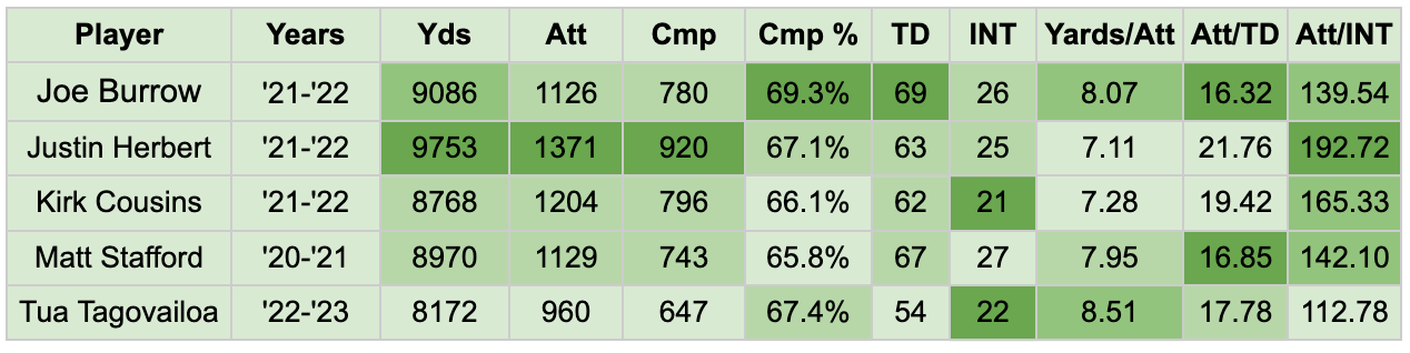 If we try to use Tua’s last two years and compare them against the two years before each of the below quarterbacks signed their respective deals (with Kirk’s Achilles year omitted), here’s how everyone stacks up: