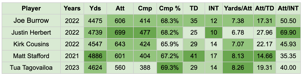 Tua’s single-season comparison echoes the same sentiments as his two-year look, but he does lead the pack in completion percentage and improves in attempts per interception, with Stafford throwing interceptions five attempts earlier than Tua.