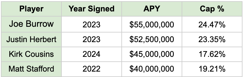 Although this $40 million valuation lines up with the Matthew Stafford comparison, Tua should push for Staffords cap share, not his APY. Stafford’s 19.21% share in 2022 equates to just over $49 million in 2024. A $49 million APY places a safe distance between Joe Burrow and Justin Herbert figures. Tua would be wise to take a shorter deal than Burrow and Herbert, since his main detractor for a bigger payday is lack of sustained success. After a couple years of repeating his 2023 performance with some improvement to his interception rate, we could see a record-setting contract for Tua. Market setting just isn’t in the cards for this extension.