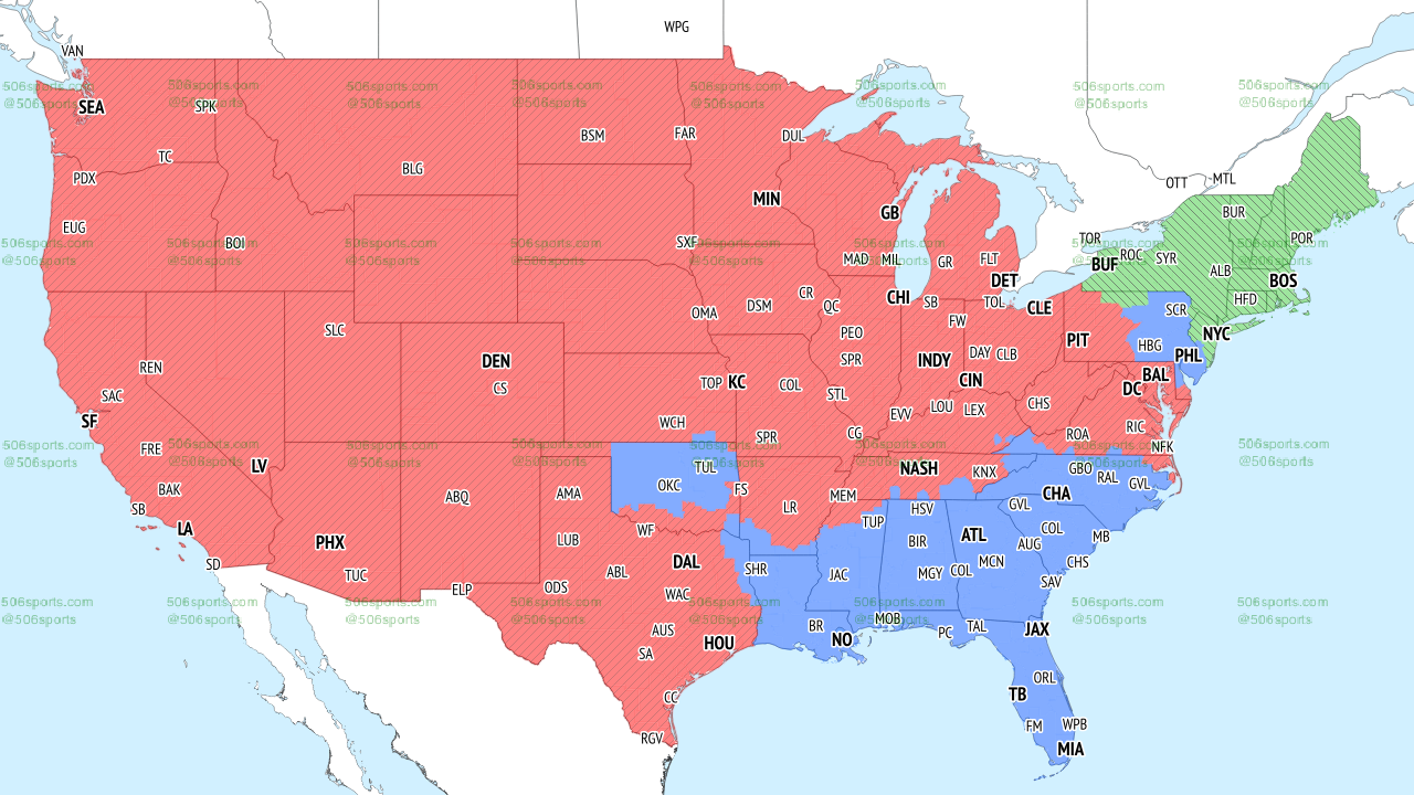 Regardless, will you be able to watch the game on TV? If you live in the red areas on the map below you'll get this game on your local FOX channels, according to 506sports.com: