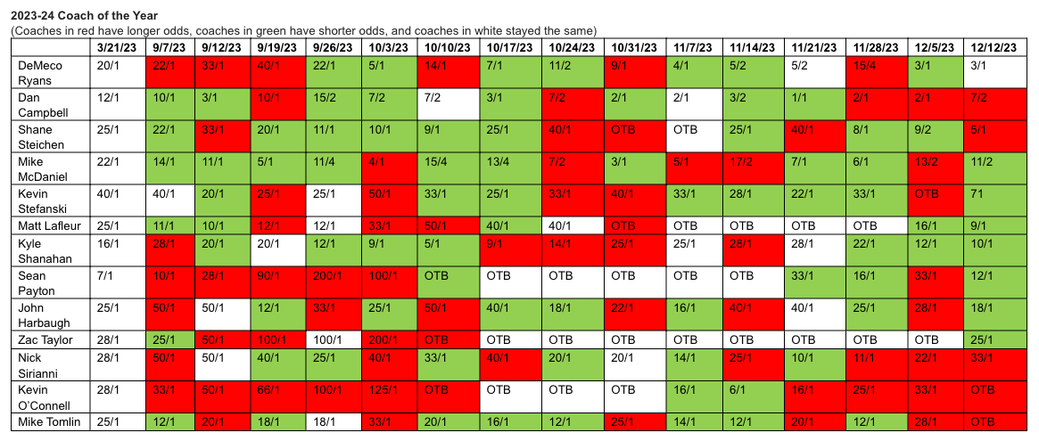 That's why Betonline.ag's most recent round of Coach of the Year odds are pretty ridiculous. O'Connell was taken off the table, despite another win and a 7-6 record. He was at 33/1 odds heading into last week.