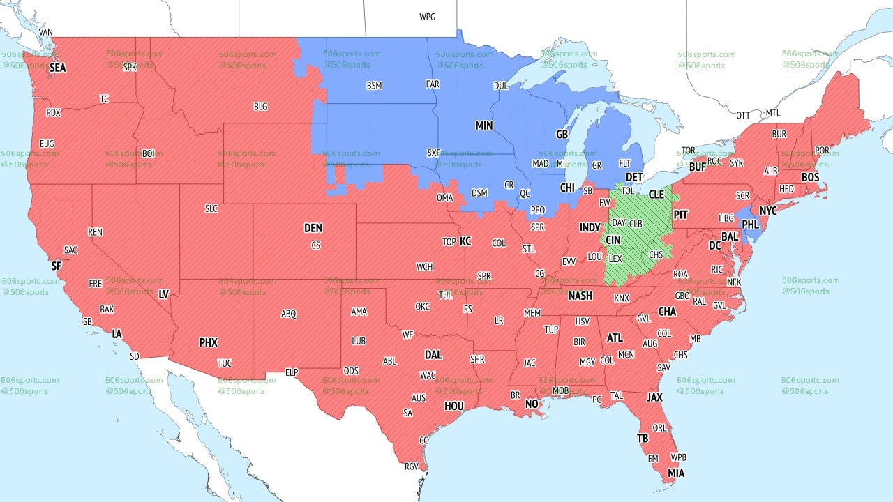 This is a unique week for the NFL. Both CBS and Fox will air two games each due to Week 18 being the end of the regular season. Everyone in blue will get to see the Vikings and Packers. while the majority of the country will get to see the Indianapolis Colts face the Houston Texans (red) and the Cleveland Browns face the Cincinnati Bengals (green).