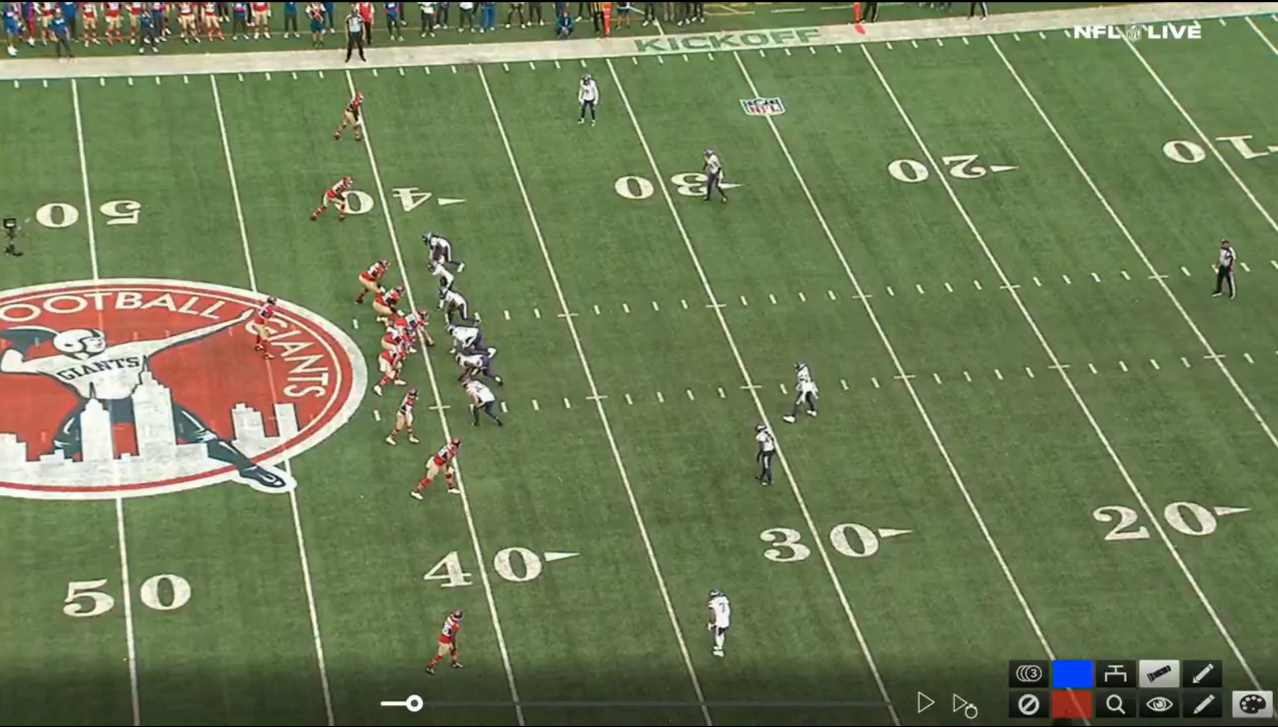 Nearly identical looks from the Vikings' defense but two completely different play calls. In the first one, the Vikings ran a zero blitz with that many players up front and against the 49ers, they dropped back into coverage and rushed just four.
