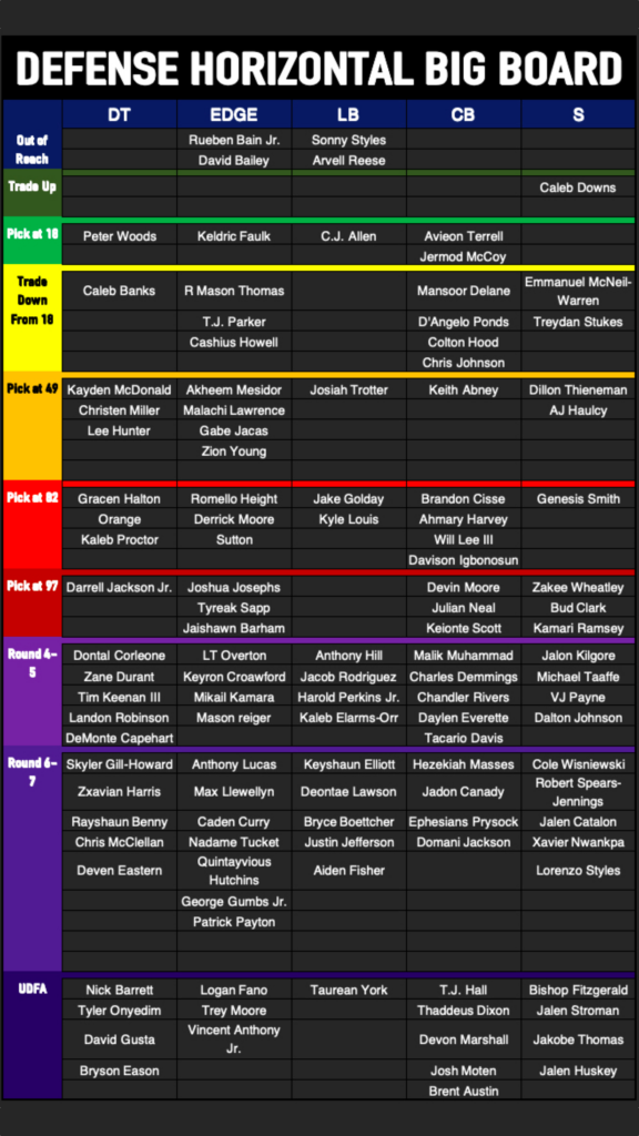 Defensively, the Vikings could realistically take any position at 18th overall, as they all have major question marks moving forward. Here is the horizontal board for the defense.