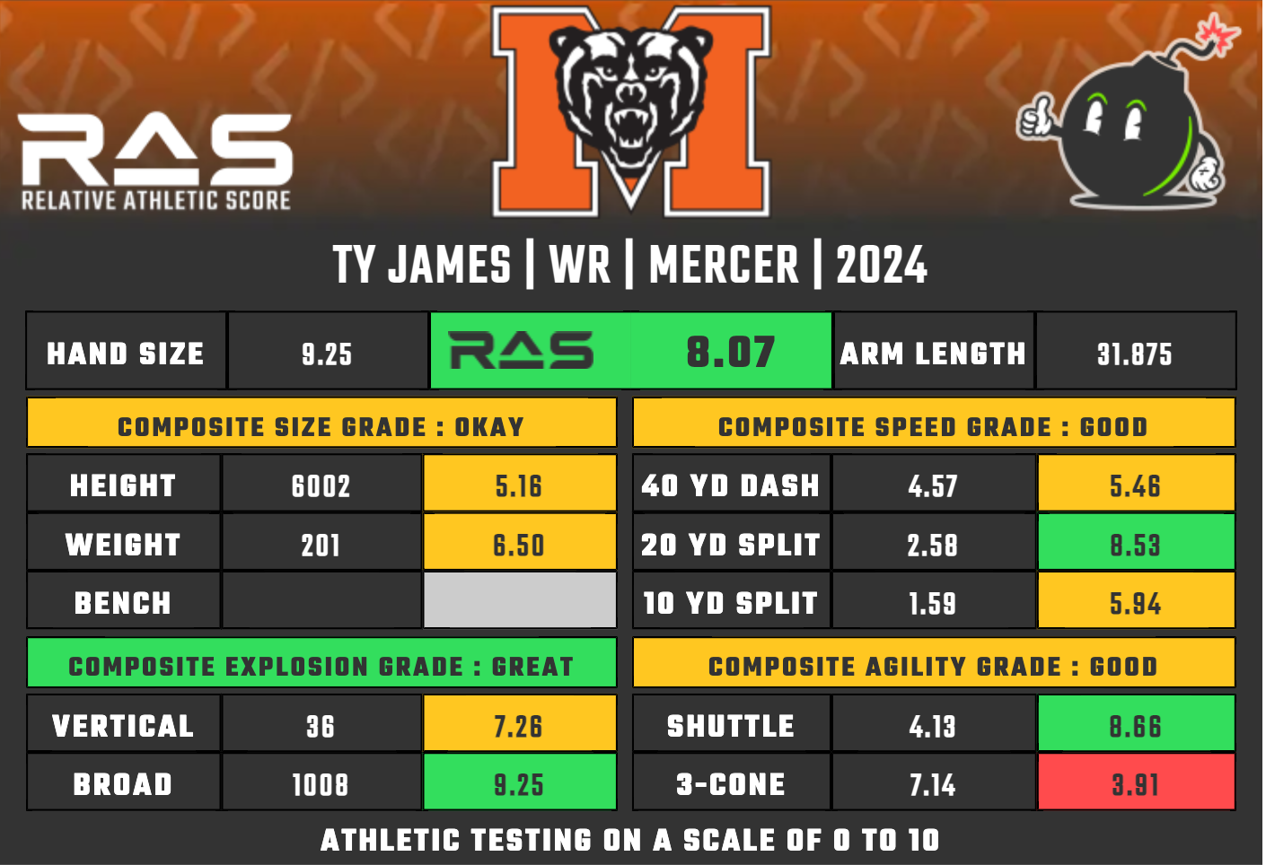 Not only is James a deep threat, but he's also a very good athlete, evidenced by his RAS (relative athletic score) of 8.07: