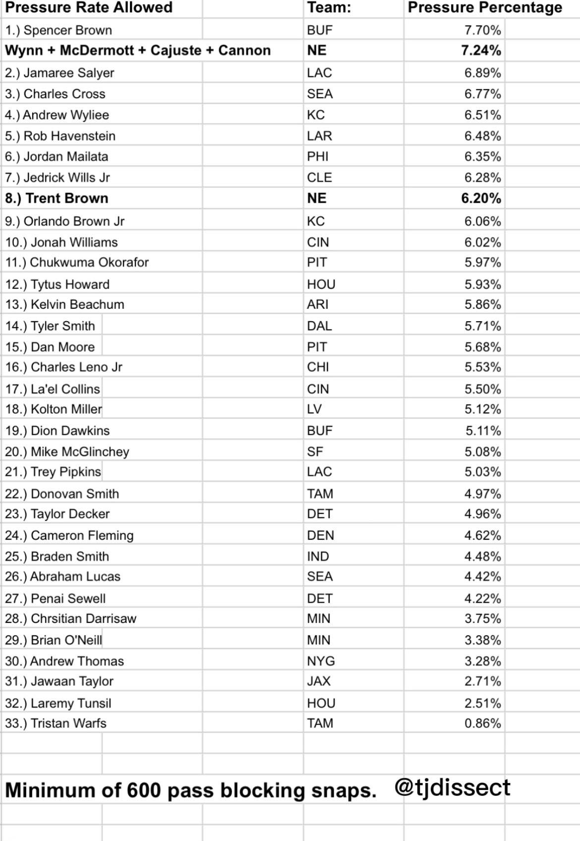 Taking a closer look, Spencer Brown had the highest pressure percentage in the NFL, allowing pressure on 7.70% of all his pass-blocking snaps. This means that no other offensive tackle allowed pressure at a higher rate than Brown did in the 2022 season.