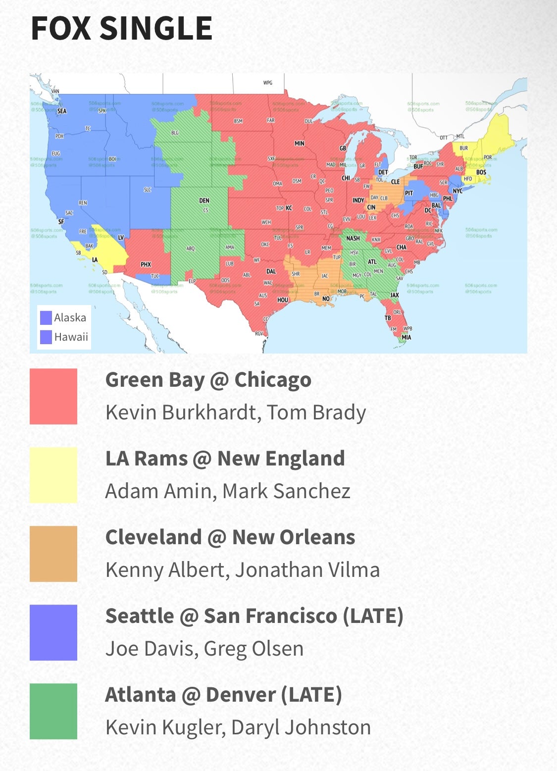 The matchup is in orange. If you are in those areas, your FOX station will carry the noon clash. As you can see, this matchup won't have as many potential viewers as some other games on Sunday.