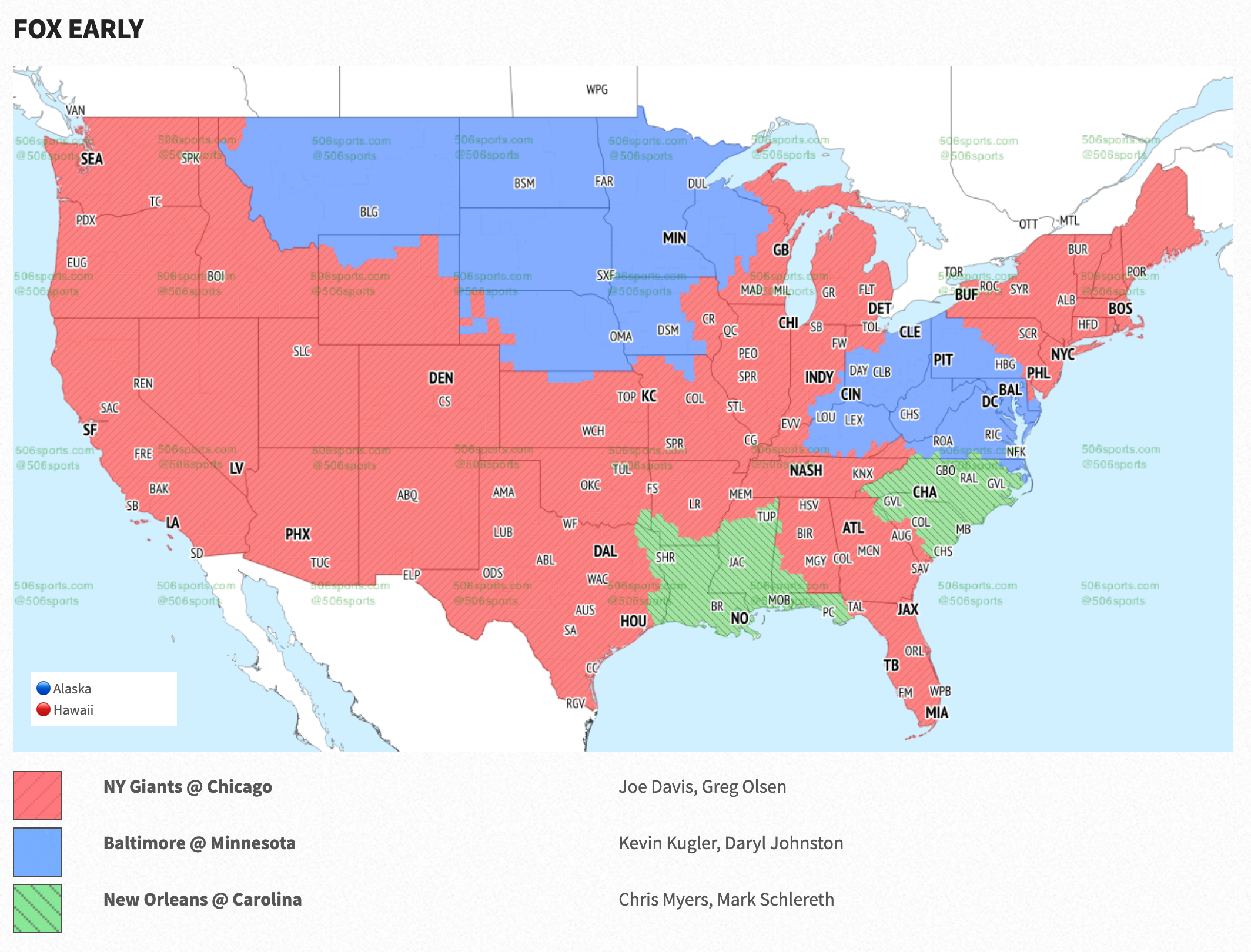 Per 506 Sports, the Giants game will dominate most of the country in the early window on FOX. The only areas where the game will not be viewable are parts of the Midwest, all of Louisiana, and a chunk of states south of New Jersey.