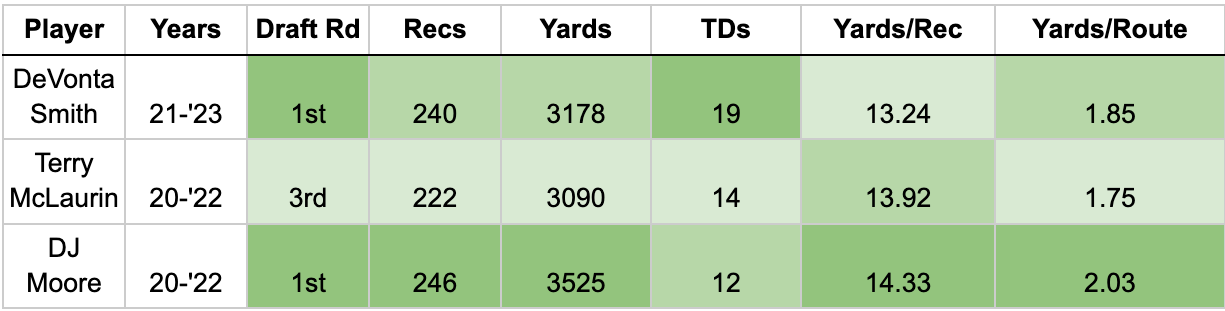 Given the similarities to these players’ stat lines and their slightly situationally-supressed market value, a range of 9.9%-11.1% of the cap would suggest DeVonta’s market value was somewhere between $25.3 million and $28.46 million if signed in 2024.