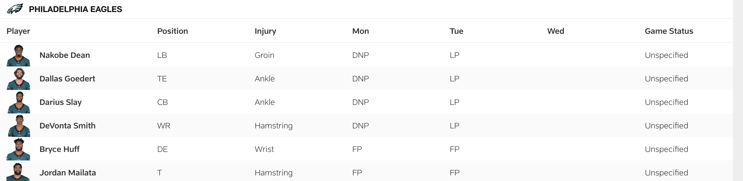 Everyone who was listed on Monday's estimated injury report participated in some capacity during Tuesday's walkthrough, including linebacker Nakobe Dean (groin), tight end Dallas Goedert (ankle), cornerback Darius Slay (ankle) and wide receiver DeVonta Smith (hamstring).