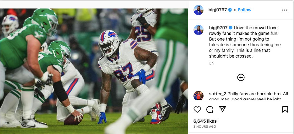 Following the Bills' 37-31 loss to the Birds, Phillips took to Instagram on Monday morning to address the heated moment in his and Lawson's defense: