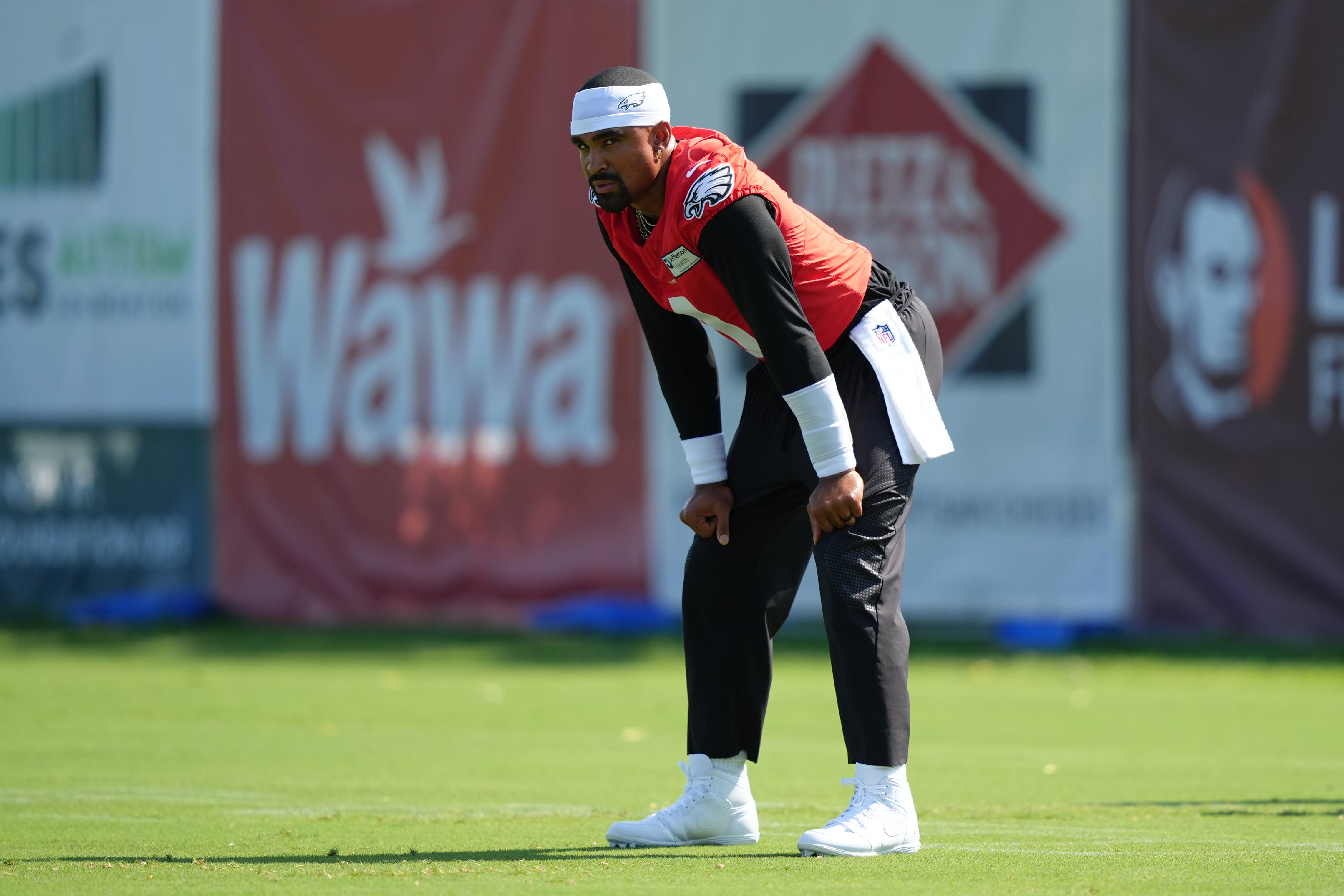 Jalen Hurts throws his first interception of the Eagles' 2025 NFL training camp