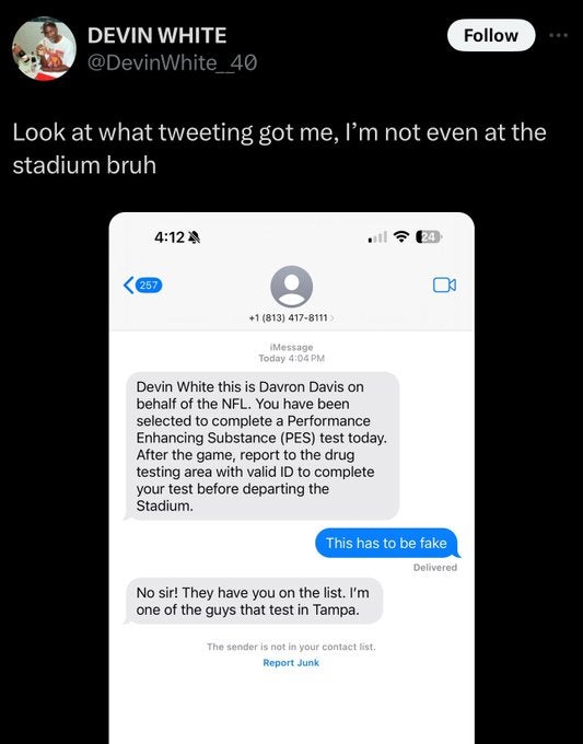 “Devin White this is Davron Davis on behalf of the NFL. You have been selected to complete a Performance Enhancing Substance (PES) test today. After the game, report to the drug testing area with valid ID to complete your test before departing the Stadium.”
