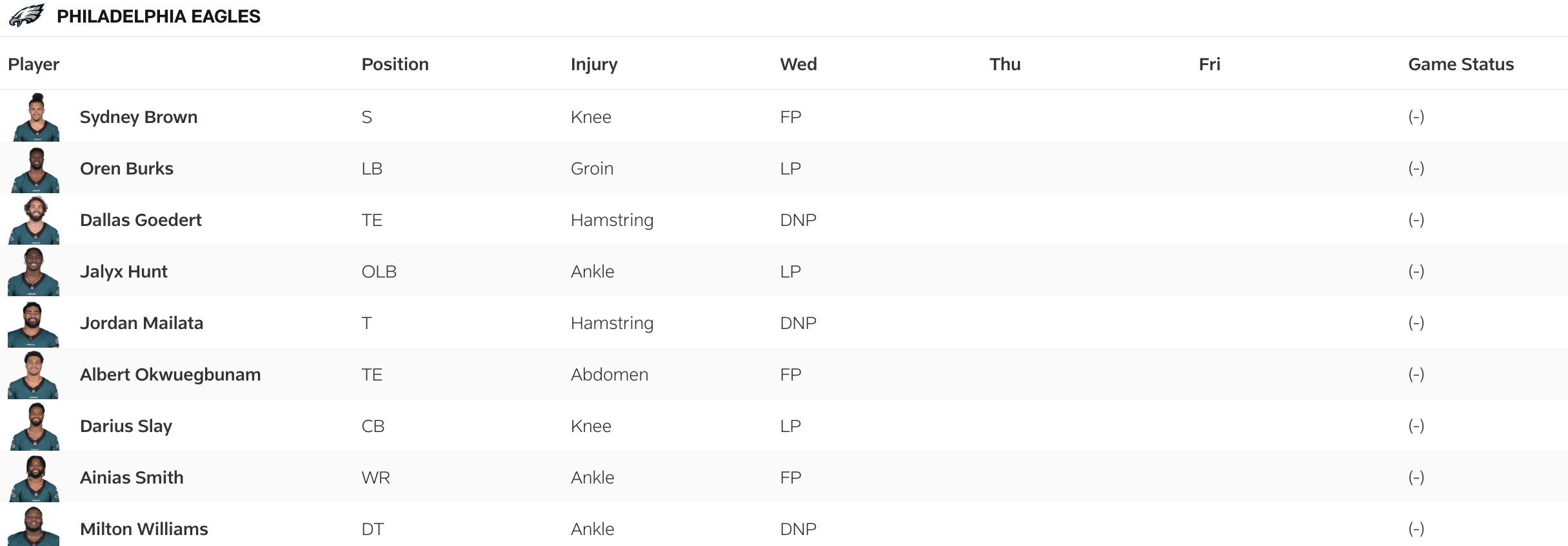 Three starters, including tight end Dallas Goedert (hamstring), left tackle Jordan Mailata (hamstring), and defensive tackle Milton Williams (ankle) did not practice.