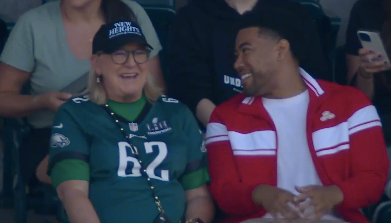 Taylor who? Mama Kelce chopping it up with Jake from State Farm at Eagles game