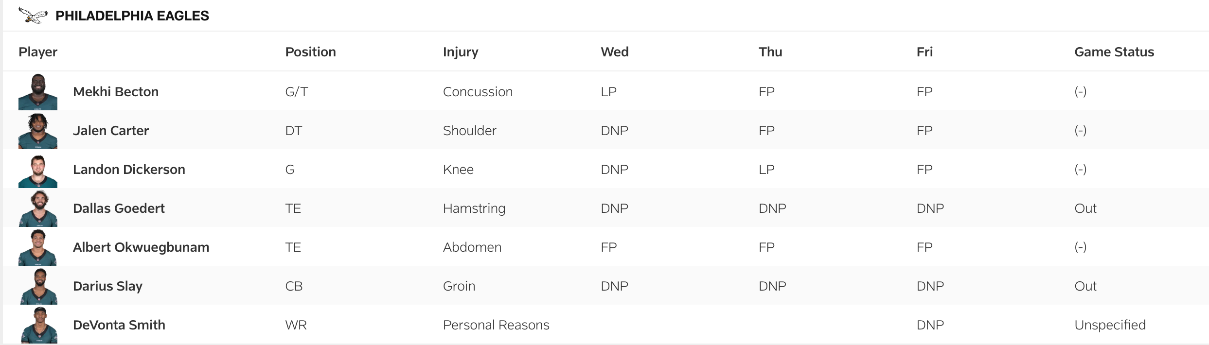 Below is the Eagles' injury report following Friday's practice: