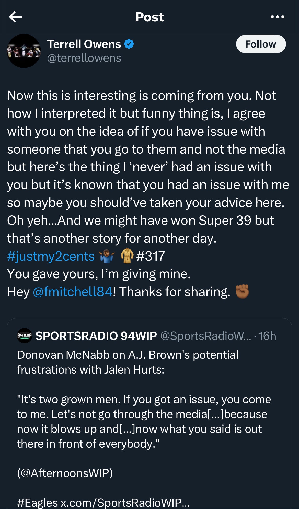 Well, his message got to plenty of eyes on social media and two very particular sets of eyes in Eagles legends Terrell Owens and Donovan McNabb. McNabb echoed Graham's message, which certainly irked Owens based off his response: