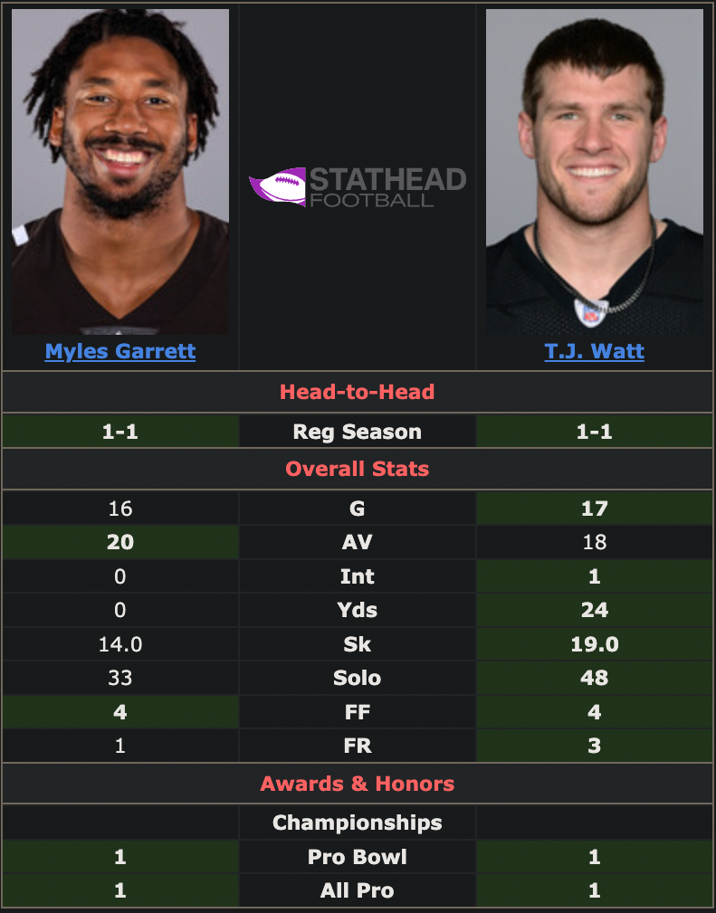 Watt leads presumptive winner Myles Garrett in virtually every statistical category when analyzing both of their seasons. This award was created to honor a defensive MVP and it is tough to argue there is a more valuable defender in the league than Watt is to Pittsburgh: