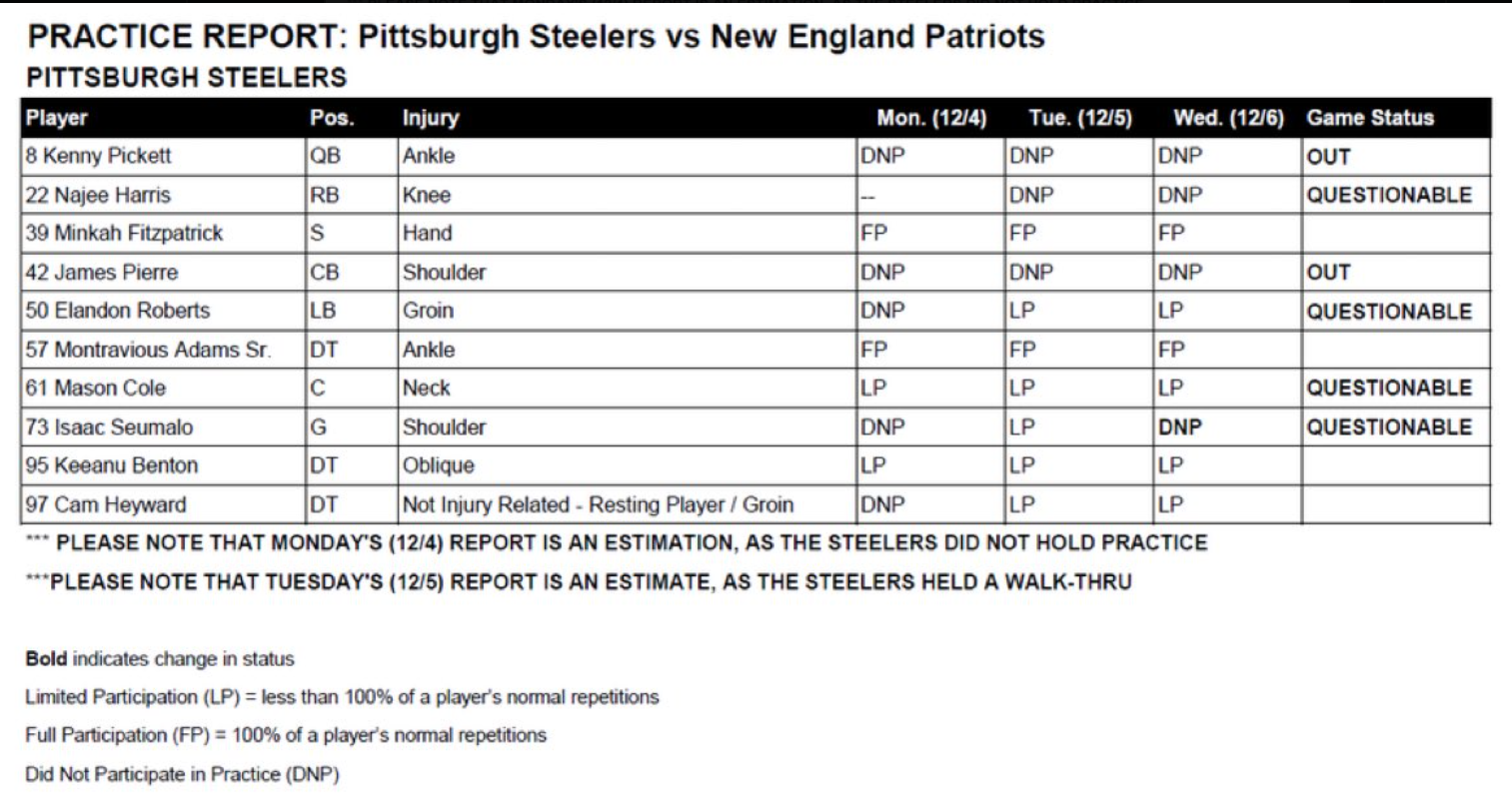 Latest injury report for Steelers vs. Patriots, Week 14