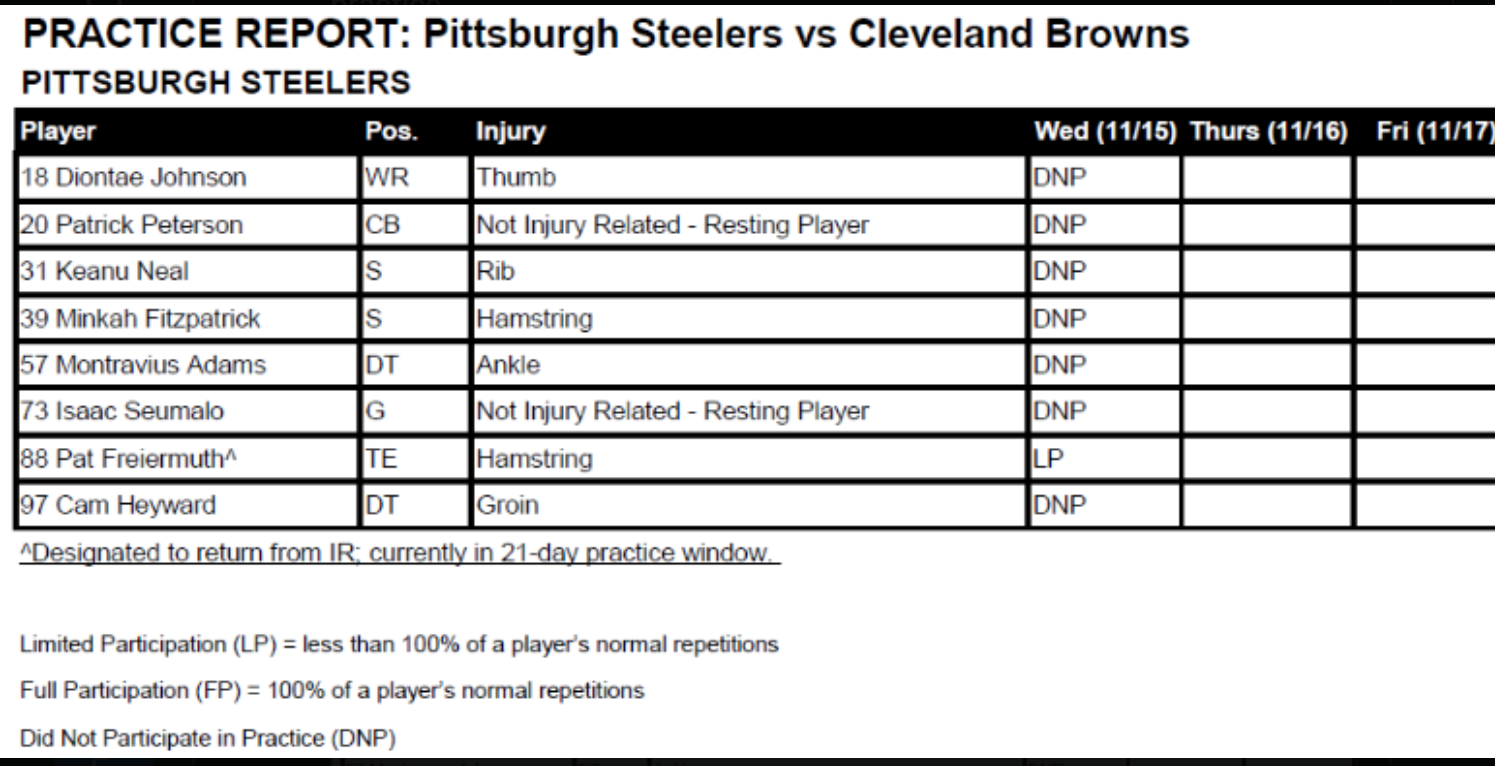 - Cam Heyward: Similar to DJ, a DNP isn't great, but Heyward has missed multiple practices since coming back from his groin injury, so hopefully it was just a precaution and not a setback.