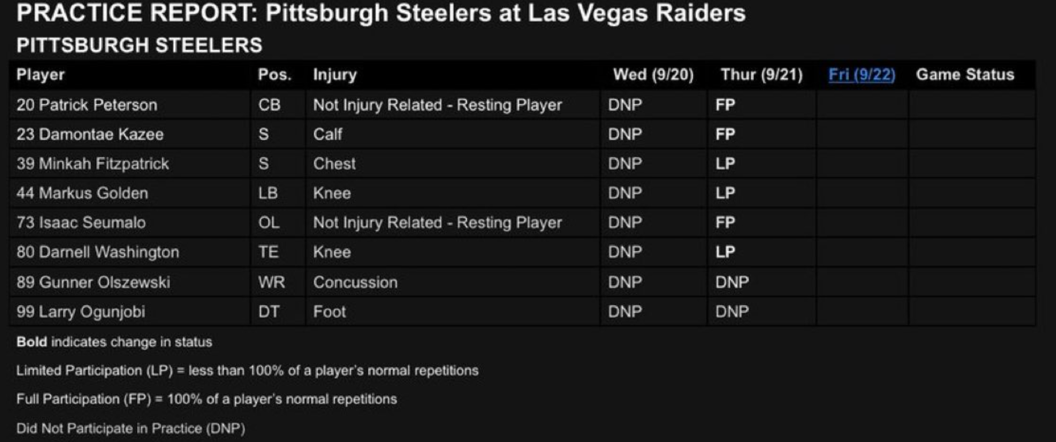 Latest injury report for Steelers at Raiders, Week 3