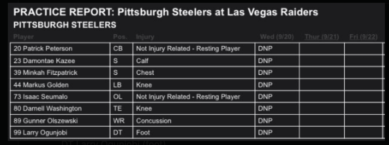 • Gunner was expected to miss practice as he attempts to clear concussion protocol but no Darnell Washington with a knee is both new and concerning