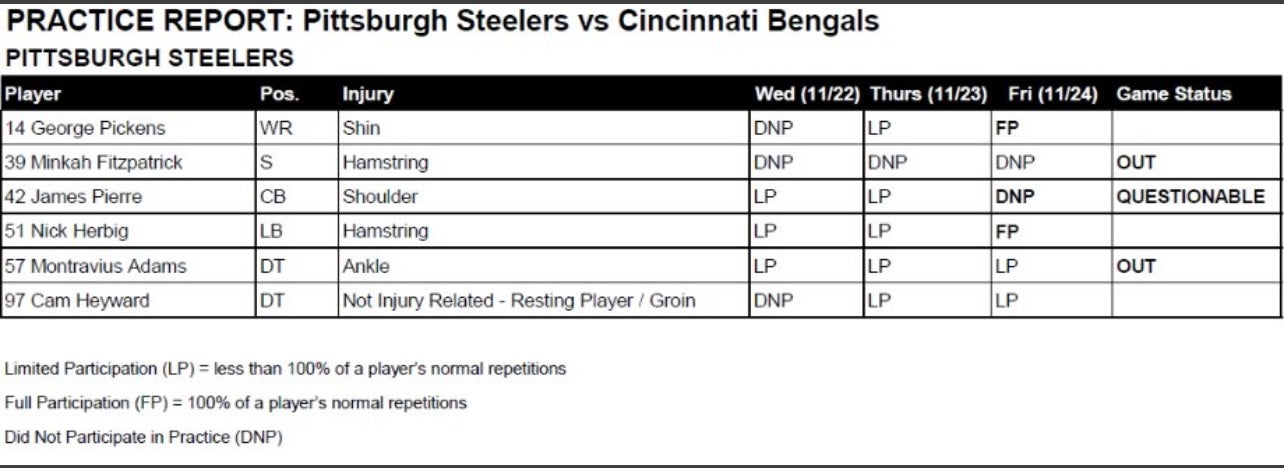 Steelers Injury Report Week 12, Friday