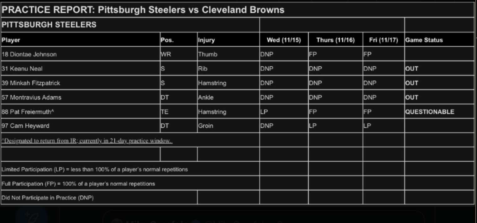 The week of preparation is officially over for the Pittsburgh Steelers. The next time they are on a field, it will be against the Cleveland Browns. Here's what the team will look like on the health front: Steelers Injury Report, Week 11, Friday Injury Report Observations: Pat Freiermuth: Muth was officially back at practice on […]