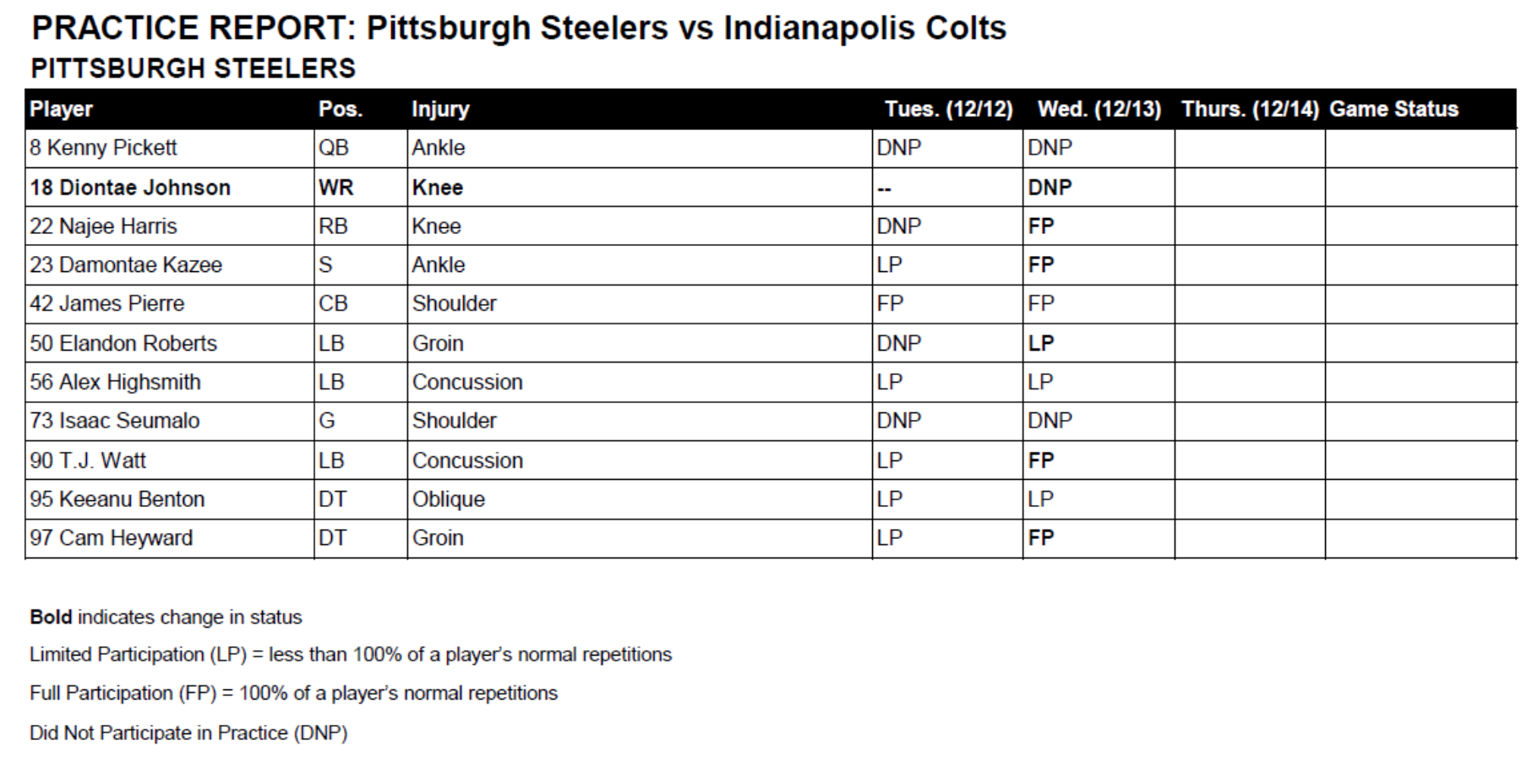 But with everything sped up this week since the Steelers & Colts play Saturday, Wednesday's report would be the most important of the week. Here is what we found: