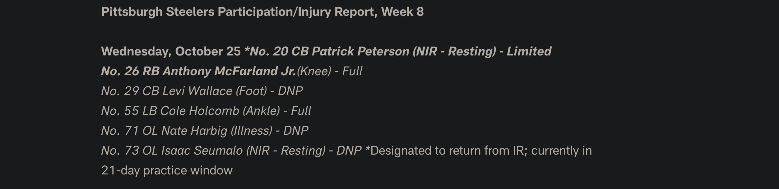• Anthony McFarland: After returning to practice last week, it was a tad surprising to see McFarland not activated off I.R. The Steelers have 21 days from his return to practice to activate him, or he will officially miss the rest of the season. He currently has 12 days left of the 21 day window.