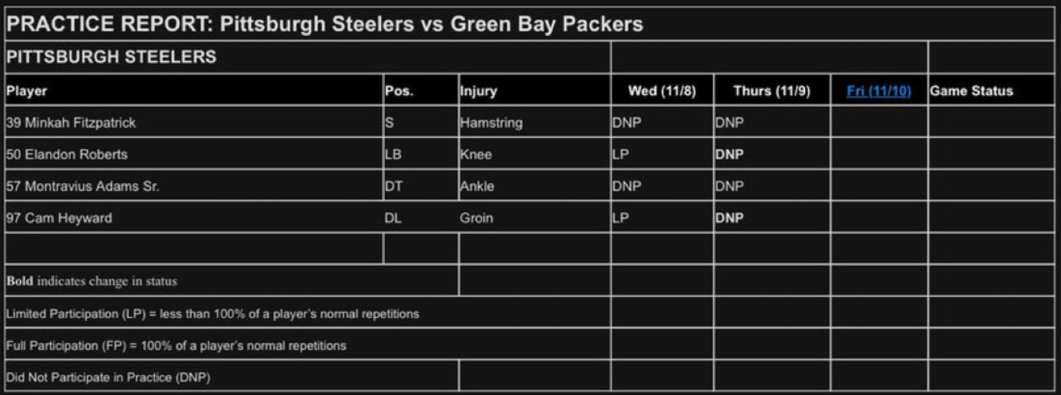 Steelers Injury Report, Week 10, Thursday
