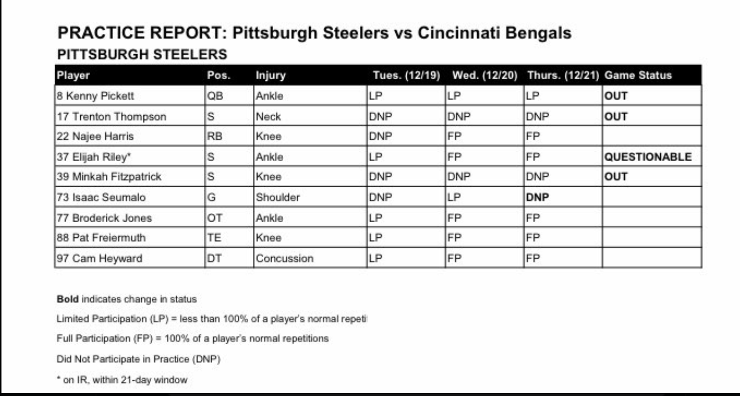 Latest injury report for Steelers vs. Bengals, Week 16